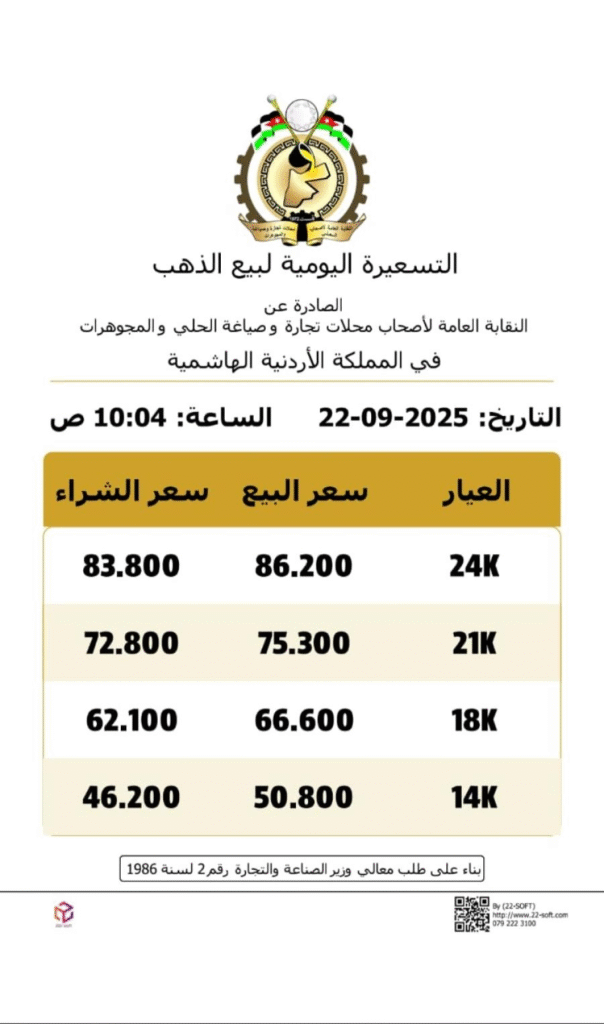 وبحسب النشرة اليومية الصادرة عن النقابة العامة لأصحاب محلات تجارة وصياغة الحلي والمجوهرات، بلغ سعر غرام الذهب عيار 24 نحو 86.20 ديناراً، فيما وصل سعر غرام عيار 18 إلى 66.60 ديناراً، وعيار 14 إلى 50.80 ديناراً