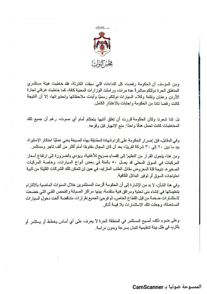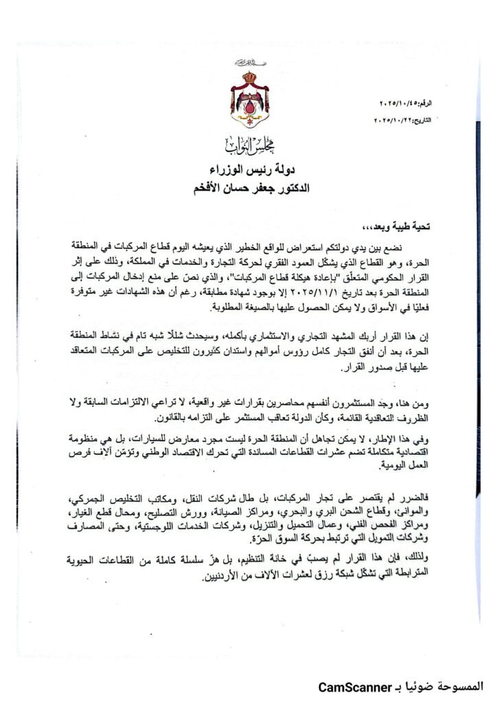 وقال النائب البستنجي، بحسب المذكرة، إن القرار فُرض دون دراسة واقعية كافية، فشهادات المطابقة المطلوبة غير متوفرة في ويستحيل إصدارها، مضيفًا أن القرار “سيغلق فعليًا أبواب المنطقة الحرة أمام حركة المركبات والنشاط التجاري.