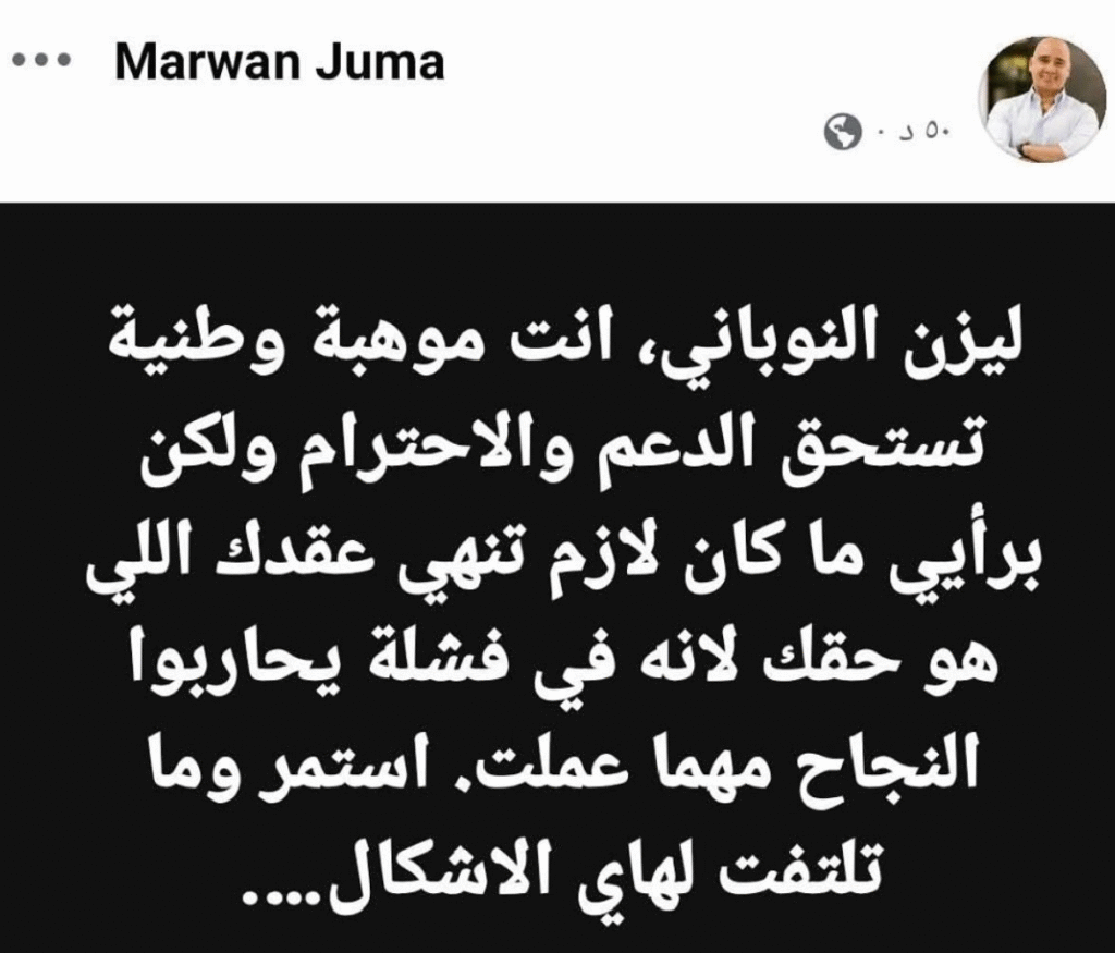 وقال جمعة عبر منشور له على صفحته في “فيسبوك”: “برأيي ما كان عليك إنهاء عقدك فهذا حقك وهناك دائمًا من يعادي النجاح مهما قدّمت. تابع طريقك ولا تلتفت إلى هذه النماذج السلبية”.